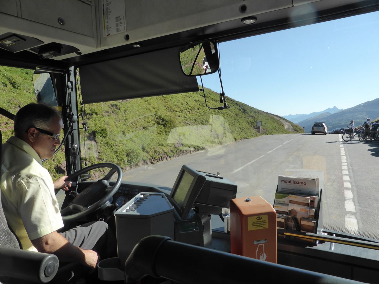 The day starts out pleasantly cool, with a view of the moon setting over the alps. The breakfast room is busy. There's 50 people there already. All those people we saw yesterday travelling to the Klausen Pass - trekkers, cyclists, motor cyclists, sports cars, vintage cars - have stayed the night in this quaint timber hotel. It’s a real tourist destination. The road was originally part of a cattle track between Altdorf and Linthal, then pre war, it was a famous 21.5k hill climb car race called the Klausen Run (Klausenrennen) from Linthal to the Klausen Pass with 136 curves climbing 1237 metres. More recently it attracts vintage sports cars emulating the race.