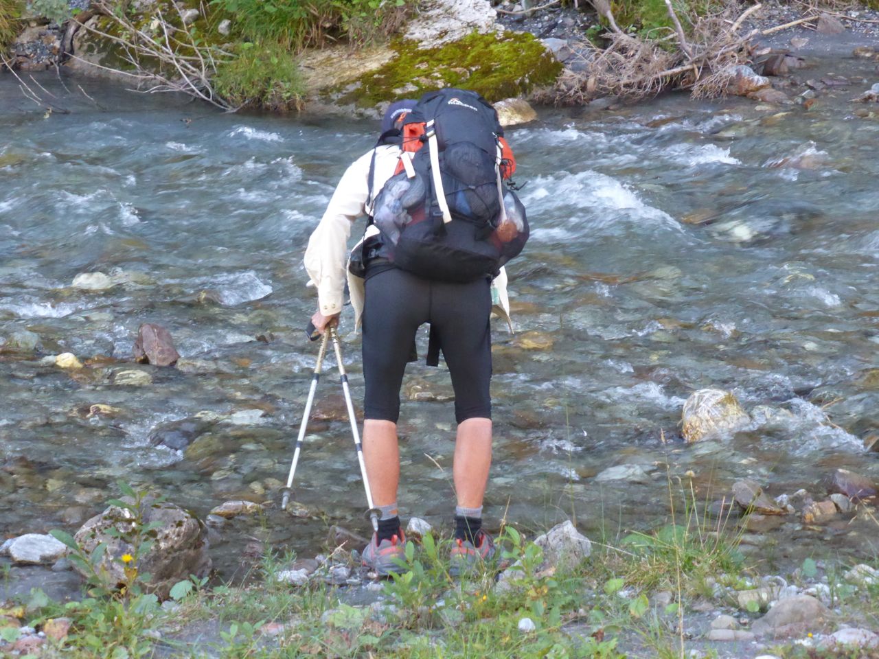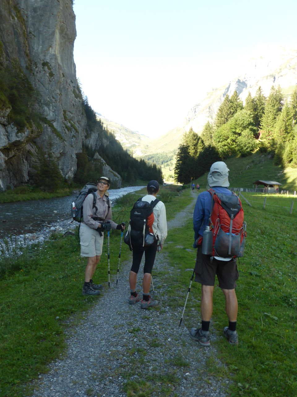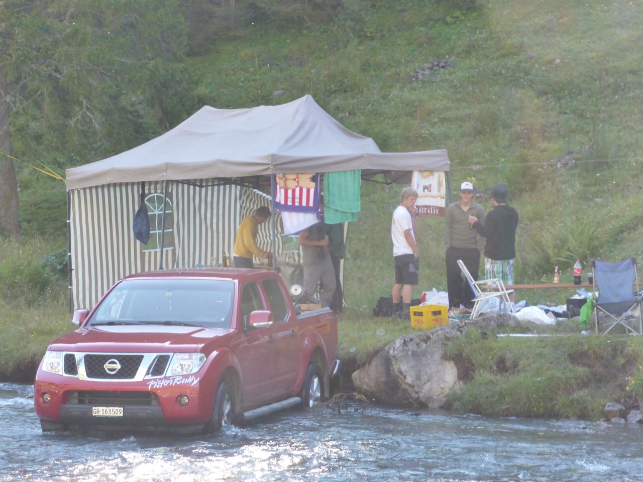 At 10am, we're dropped off at Urner Boden in the flat valley and walk over to a fast running stream in the shade of the mountains. It's lovely and cool in the shade beside the cool water, but as soon as the track passes into the sun, the temperature increases by 5ºC. The stream is dotted with campers and soon we spy a Nissan Piston Bully parked in the stream, with 6 guys already drinking beer under their large open sided tent, with cartons of beer cooling in the icy water - they must be Aussies!