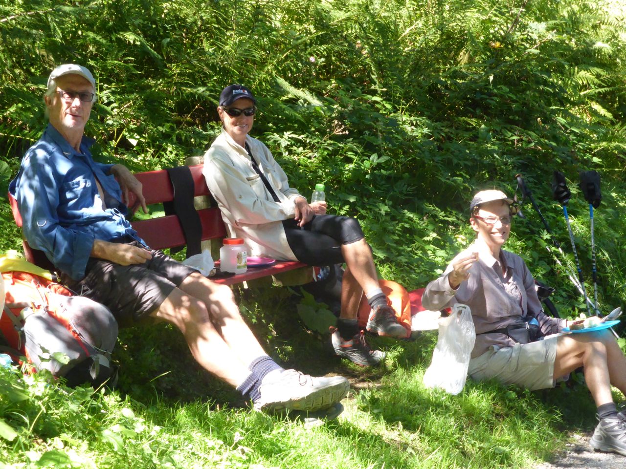 There's a short sharp 200 metre climb out of the valley to a gravel road running through meadows, and we stop for a coffee break in the shade looking back at the Klausen Pass with hundreds of vehicles of all descriptions glistening on the zig zags. The next few k is through shady pine forests around a balcony high above Linthal down in the valley. It's hot, and even the water trickling above ground from higher up is warm to drink. The locals tell us it's the driest and warmest summer for a long time. Lunch is on a seat in the forest and we demolish all our left overs ready to replenish supplies in Braunwald. We take our time as we’re expecting a shorter day of 12k.