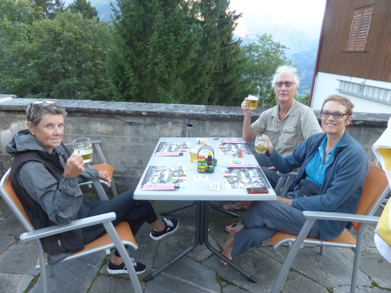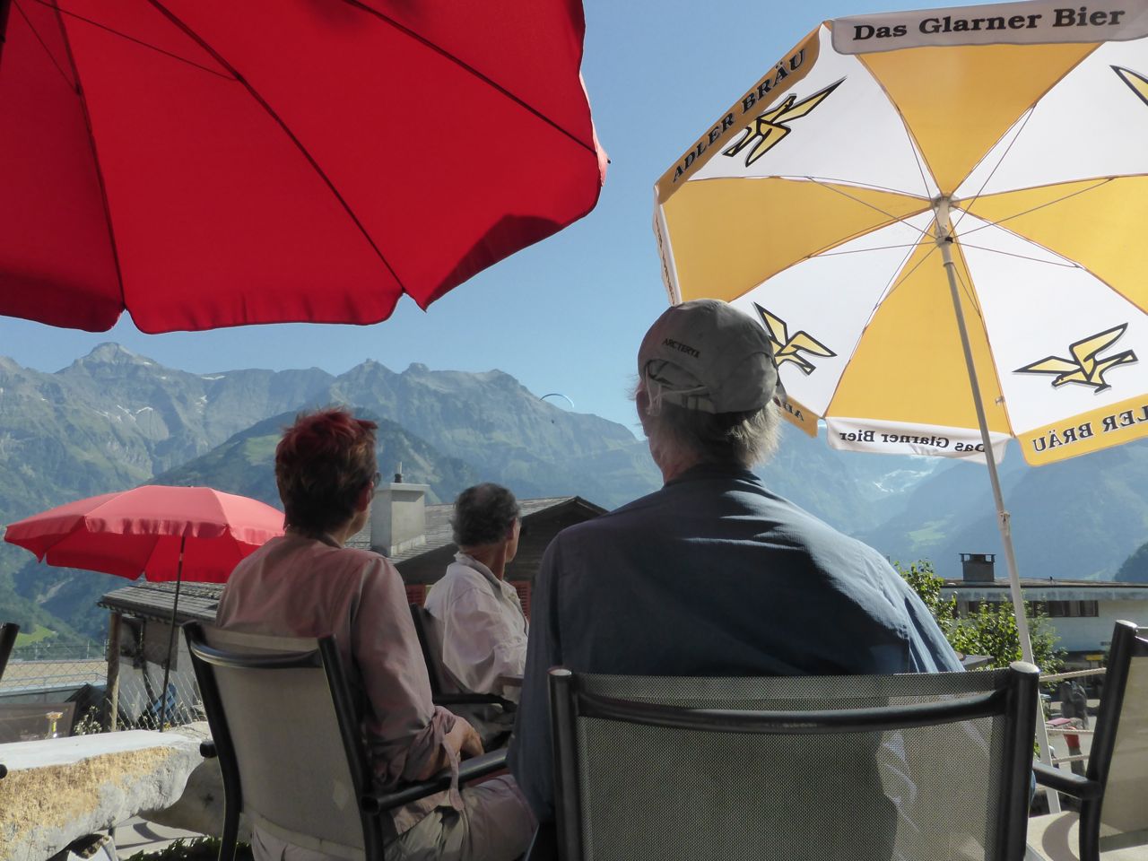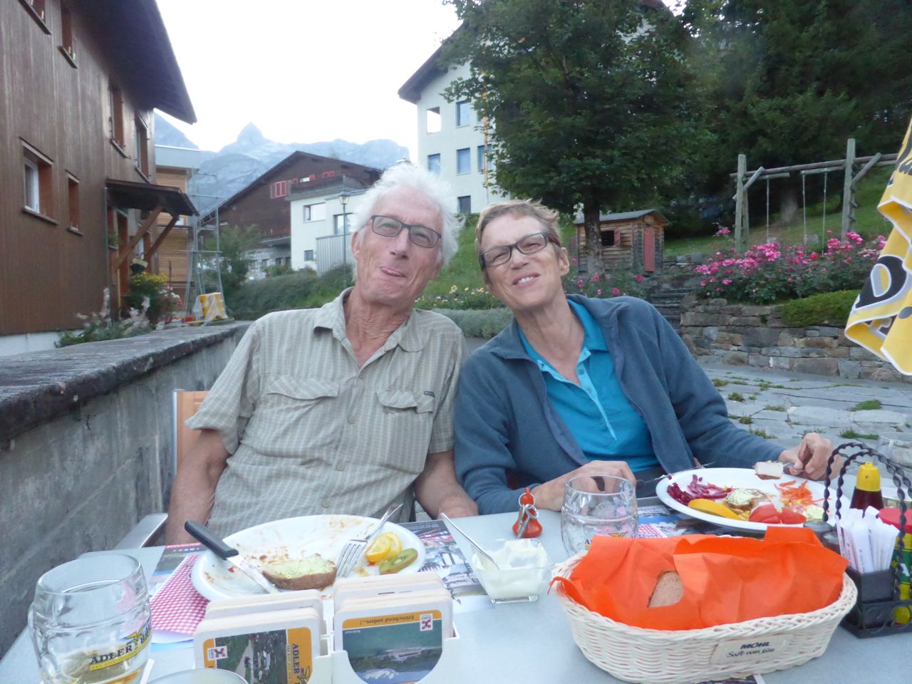 We arrive in Braunwald at 2.30pm only to find that the only Maxi shop is closed - it's Sunday of course, and the Adrenalin Backpackers doesn't open til 4pm. Graham and Jenny find a beer garden - peanuts with cold beer is nice while we watch the hang gliders. At 4.30pm, we're back at the Adrenalin Backpackers Reception, and it takes about 20 minutes to sort out a room upgrade from one 4 person room to two double rooms - all at the same price!! Well done Jenny!! Thank you!! The rooms are perfect - nice shower, clean sheets and it's quiet - mostly because there's no cars up here at 1500 metres. We're right next door to the Bahn Station cog train that will take us down to Linthal in the valley tomorrow.