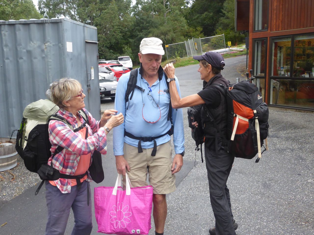 The first thing we spy inside the supermarket is the Backcountry dried food stand, where Graham and Jenny and Donna and Milton choose their dinner. I had already bought a fe Back Country dried mince packets in Australia. I like plain food with out the spices and herbs etc. An hour later we each have a basket full of goodies and we're out the door and into the rain.