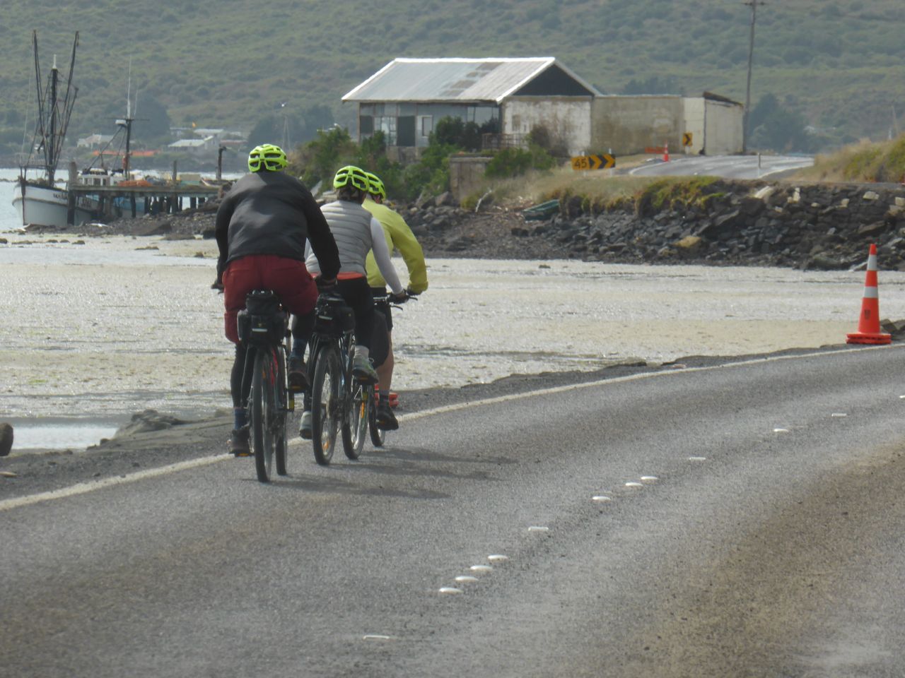 A leisurely start at about 8am to our own breakfast of tea, muesli and yoghurt - and toast for some. At 9.00am we cycle off down the steep hills to the Dunedin train station where we meet Sean, Helen, Christian and Jeff before heading out along the busy main road around Dunedin harbour to Taiaroa Head, just over 60 round trip. Its a cool 5°C, not freezing, but cool enough for 2 jackets, beani and gloves and we're riding into the wind which has abated somewhat over the past few days.