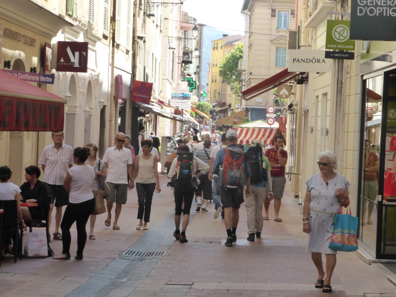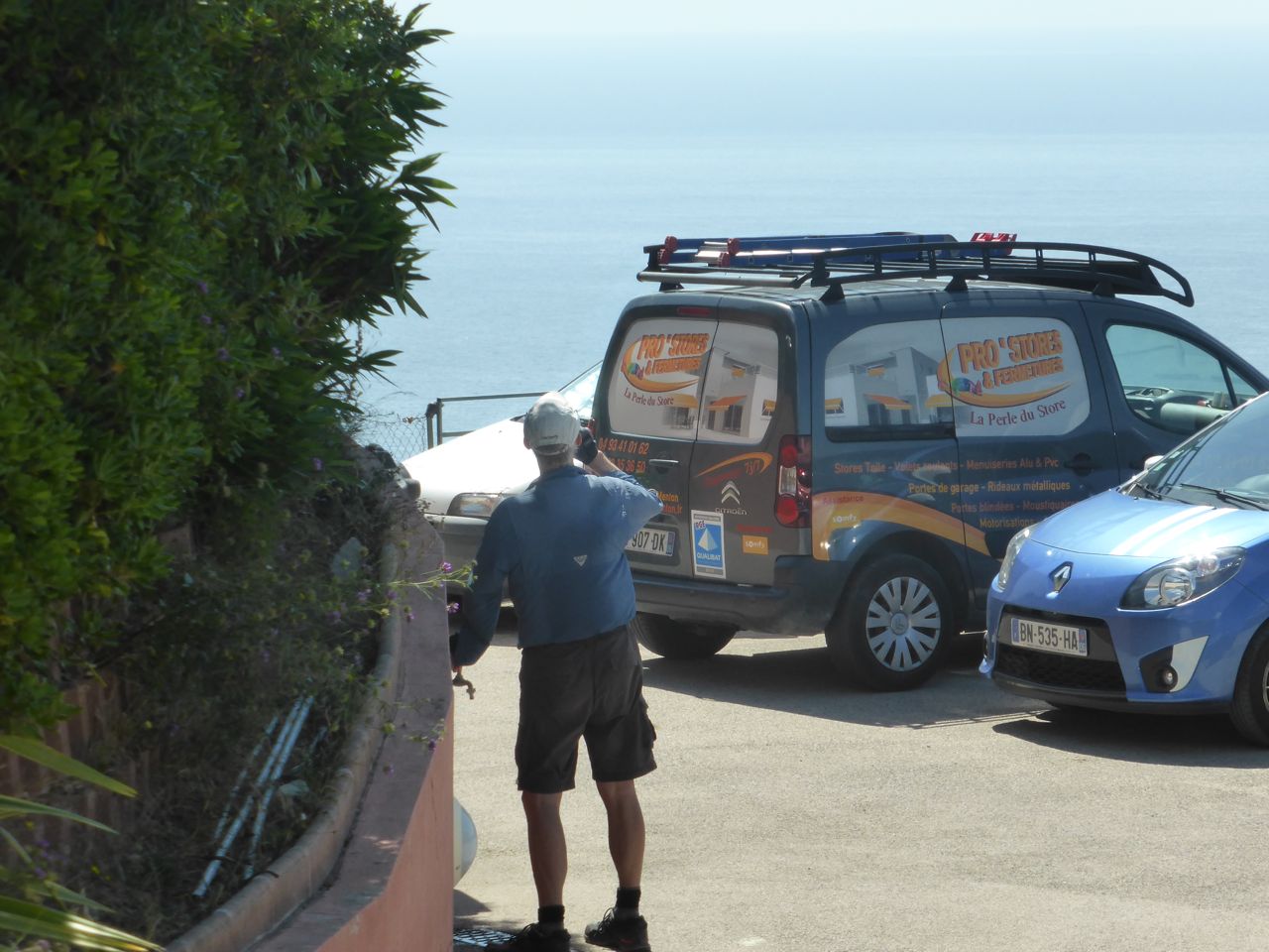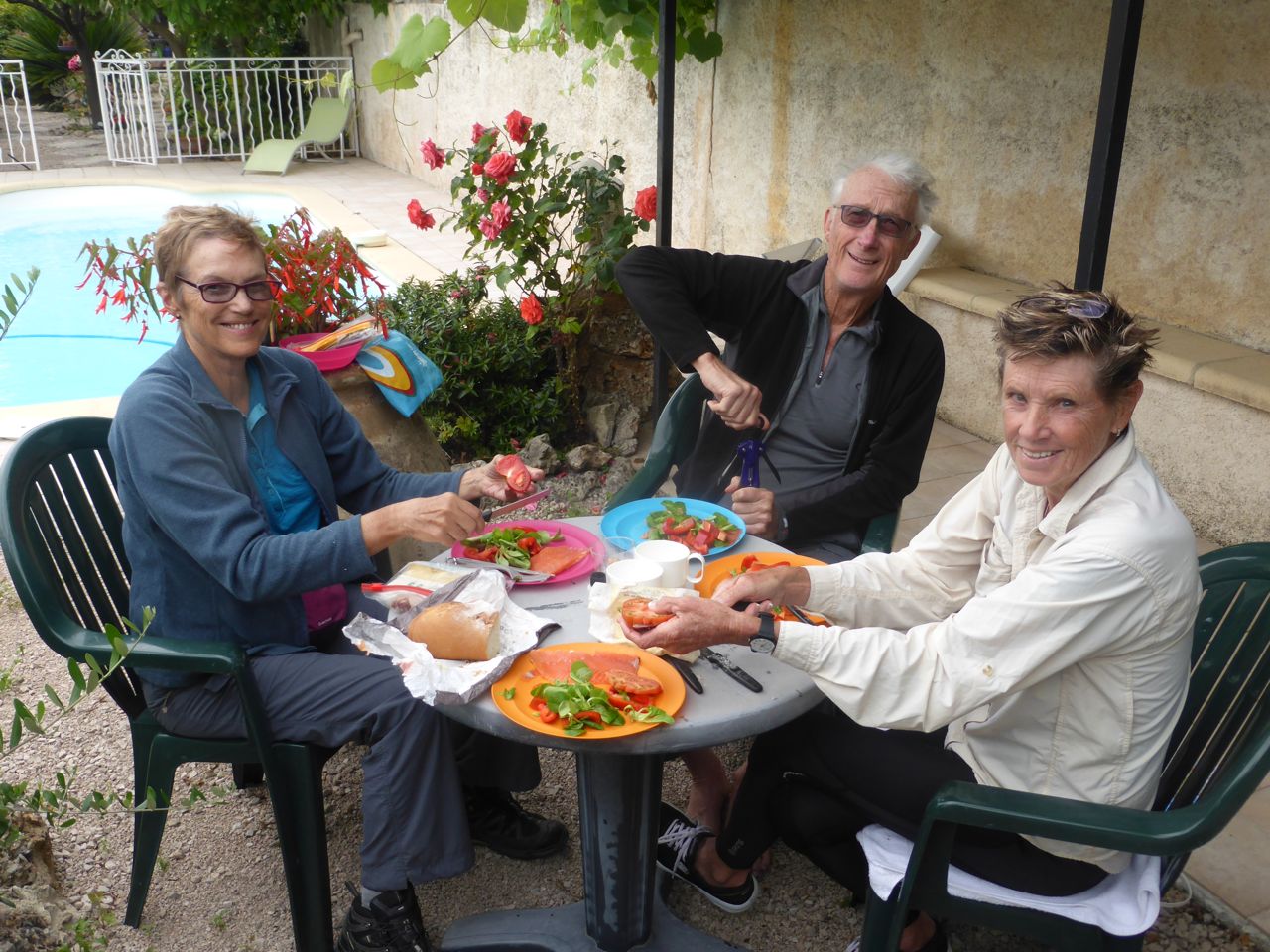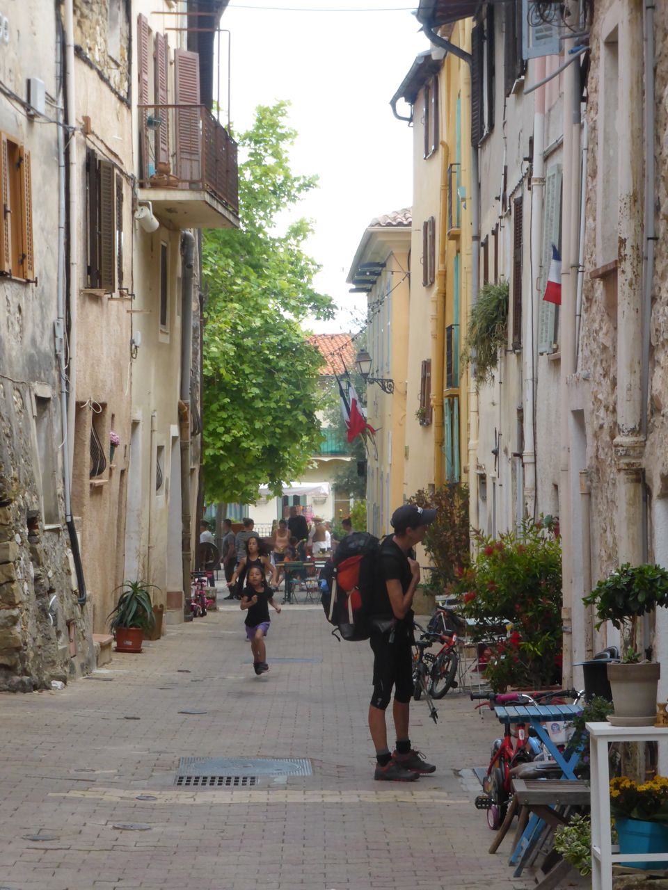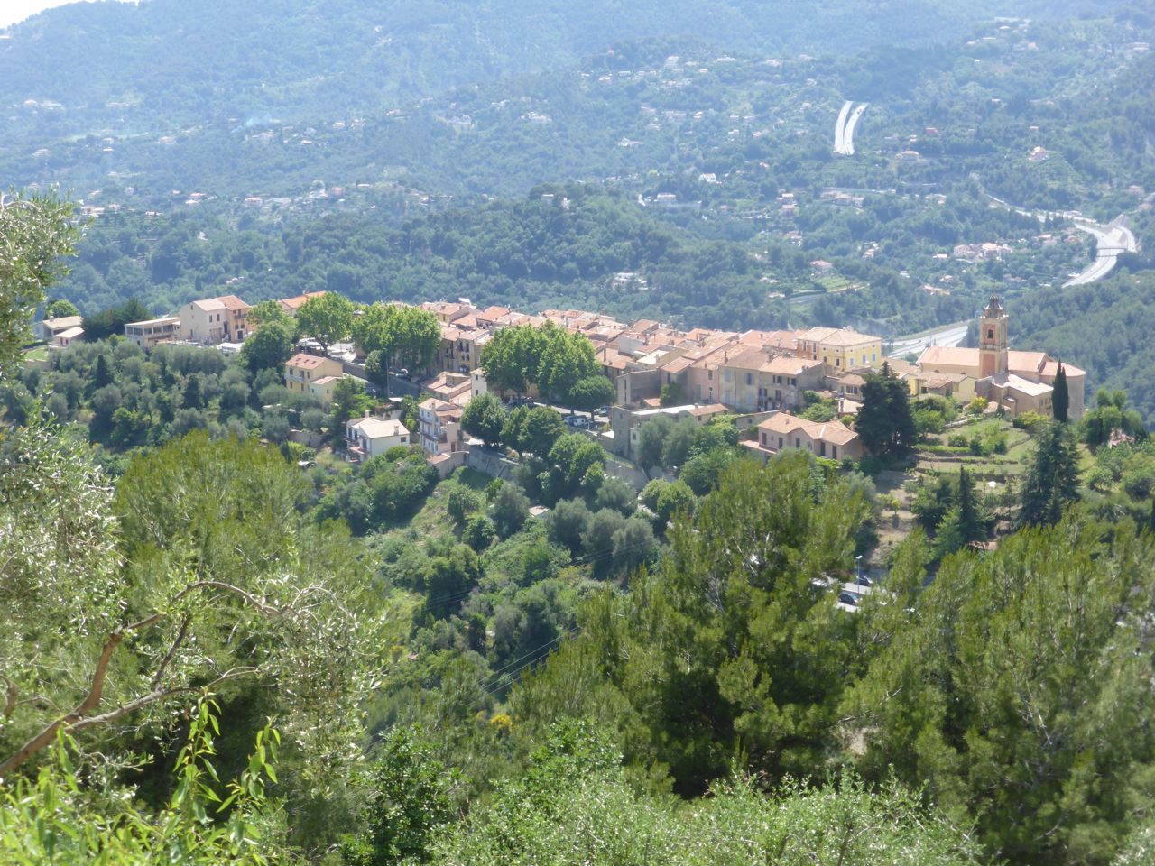Another one and a half hours of up, and we come to a high point at 729 metres with a sign off to Mont Carpano, another 50 metres higher. The views couldn't possibly be any better so we continue on. The breeze has picked up and it's cool in the shade and hot in the sun, so lunch is under a shady tree out of the breeze with more views to Monte Carlo. We see the hill top village of Castellar down below and after our bread, cheese, tomato and ham lunch, it's a short walk along to Plan de Lion, then a steep walk down to the mediaeval city of Castellar. It's a car free village, the streets around it lined with cars, and when we walk through the narrow streets, we see why. The three parallel streets are linked by tunnels through the old buildings, many of which date back to the 16th Century. There's one restaurant and one small shop. The whole village is only 100 metres long, and at the end, there's a track leading down to our Chambre d'hote L'Aleandra. Our host greets us and shows us to our rooms in her private house, and gives us a guided tour of the balcony which we decide will make a perfect place for our picnic tonight.