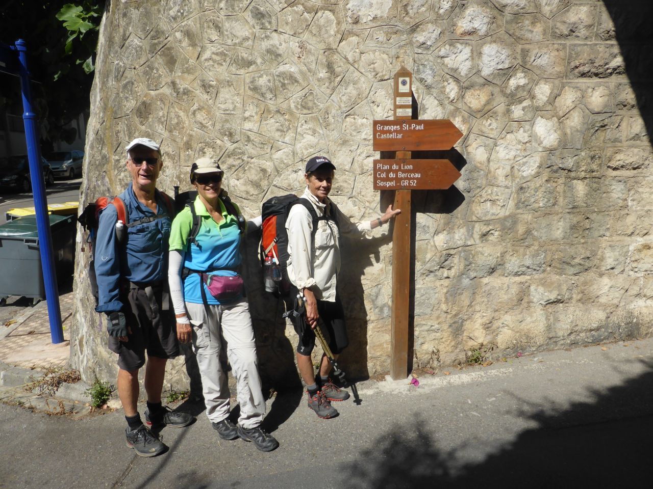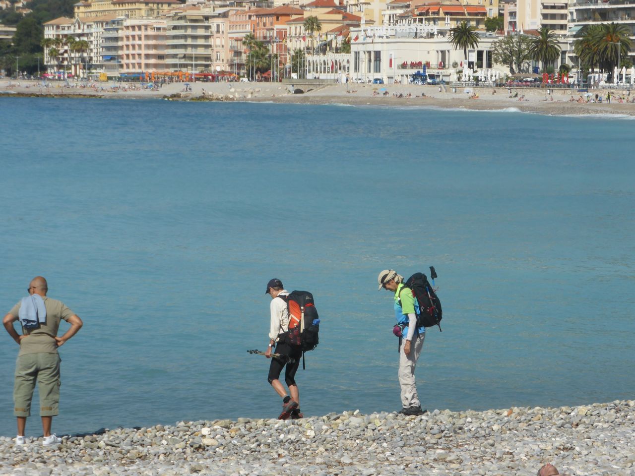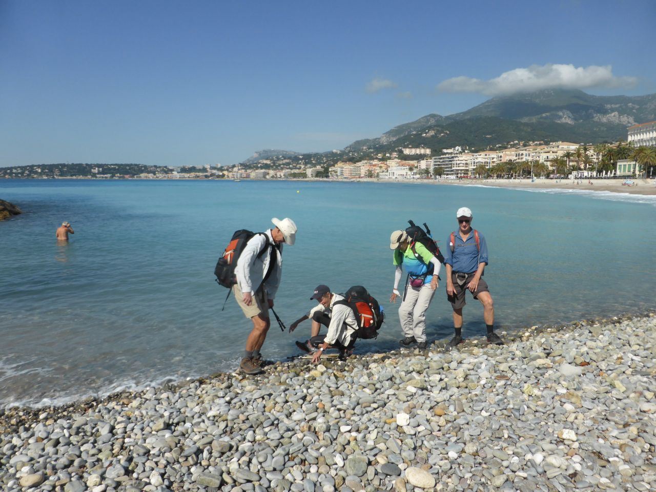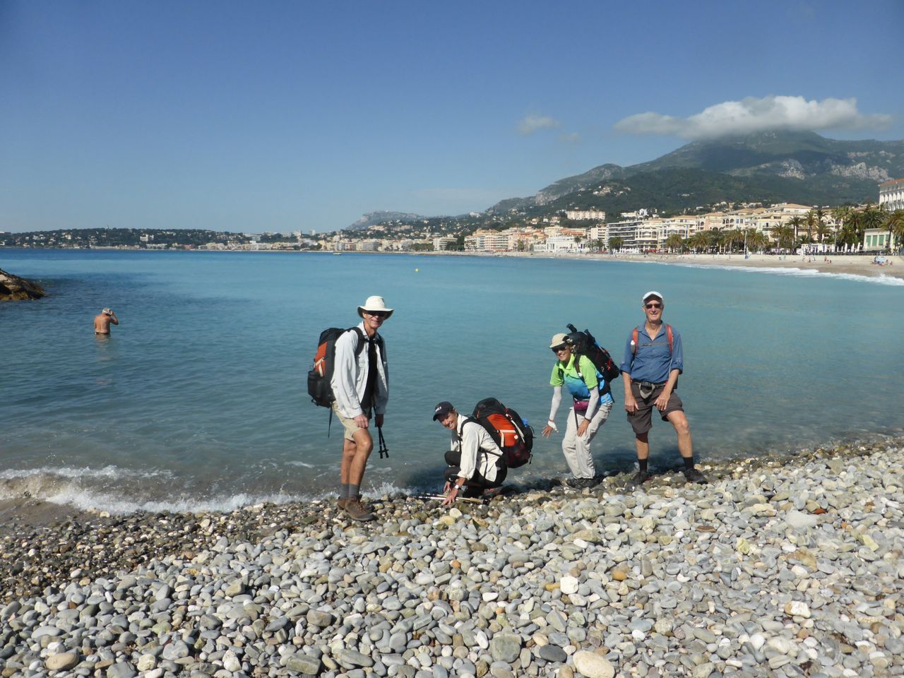 Next stop is Carrefours supermarket again. We need enough for lunch and dinner today, lunch tomorrow and breakfast and lunch the next day - bread, cheese, tomatoes, and two packets of salmon. We set off along the harbour's edge to the Gare Menton-Garavan where the GR52 officially begins. The GR5 Guide book says to touch the waters of the Mediterranean at the beginning or end of the GR5, depending where you start from. So down to the water for a photo shoot. Some guy is inquisitive as to why we’re twaddling our hands in the water and volunteers to take a photo. But then a wave rolls in. I manage to lift my legs just in time, but Jenny and Ian are too busy posing for a photo and their boots get swamped.