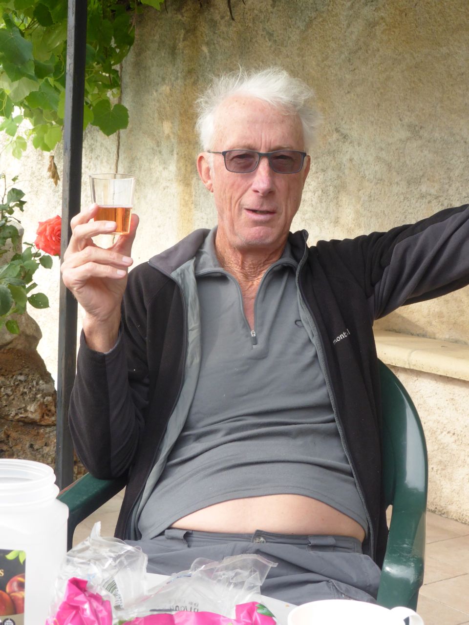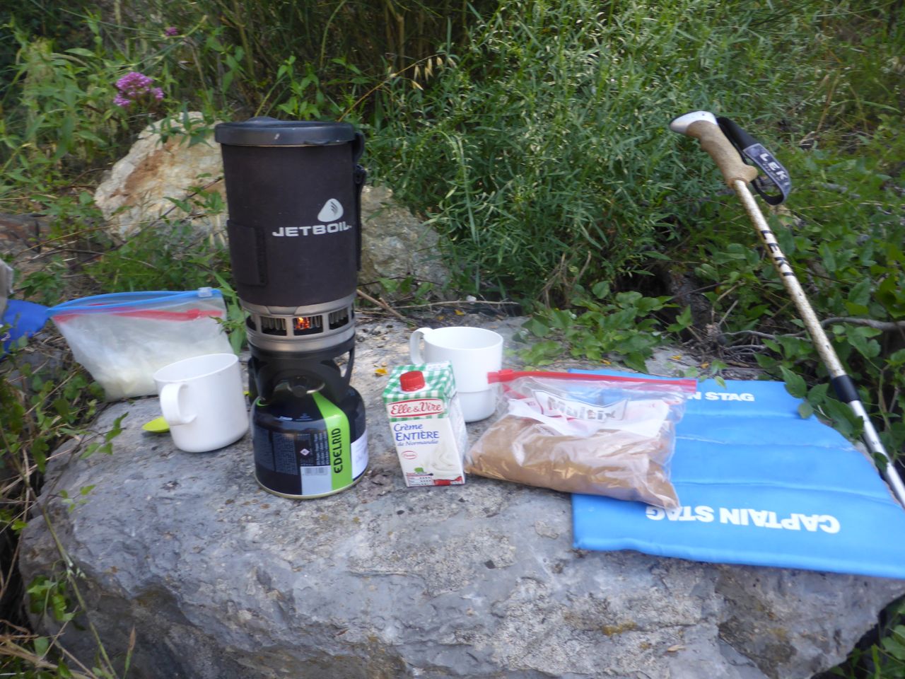 Graham has a snooze and after a shower, Ian and I walk back to the village to the tinsy shop to buy a bottle of wine for our picnic. We decide a Rose Champagne is warranted to celebrate our first night on the GR5, and add a bottle of still Rose and President's Cheese because we can. Our picnic is delightful, recapping the day and solving the world's problems, whilst eating smoked salmon, bread and salad. A cup of tea after dinner with an electric jug, some blogging time, some checking maps time, then bed.